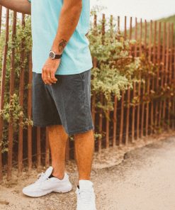 Laid-back meets modern in these hybrid shorts, a polyester-cotton-elastane blend with a relaxed fit and knee length. Faded wash with classic denim-style back pockets and a recycled plastic button closure.