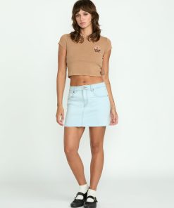 Insanely soft viscose-elastane jersey blend hugs curves. Fitted baby tee with branded chest graphic serves casual, California surf vibes. Striped interior neck taping and contrast shoulder seams add stylish edge. Cropped length complements high-waisted bottoms.