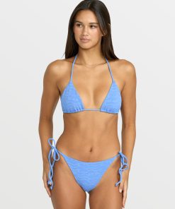 Flaunt sustainably chic beach style in this sleek halter tri bikini top, crafted from an eco-friendly recycled polyester blend. Adjustable for the perfect fit, it features removable cups for customizable coverage and a modern metal accent rivet.