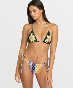 Recycled nylon blend shines bright with ‘Starlight Glow’ print. Adjustable halter top, removable cups, metallic rivets. Sustainable stretch swimwear radiates sunny beach vibes.