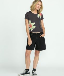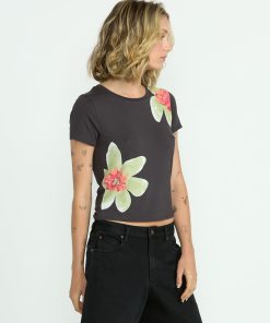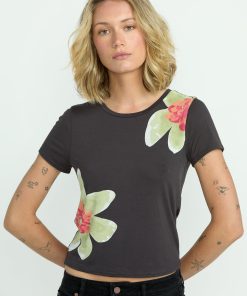 Soft viscose blend tee with a playful floral print. Fitted, flowy style with cap sleeves and crew neck. Stylish elevated details: metal badge on back neck.