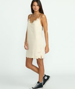 Slinky, luxe-satin slip dress with alluring lace details. Slim silhouette features sultry side slits, V-neck, and brand’s signature metal badge. Equal parts romance and edge.